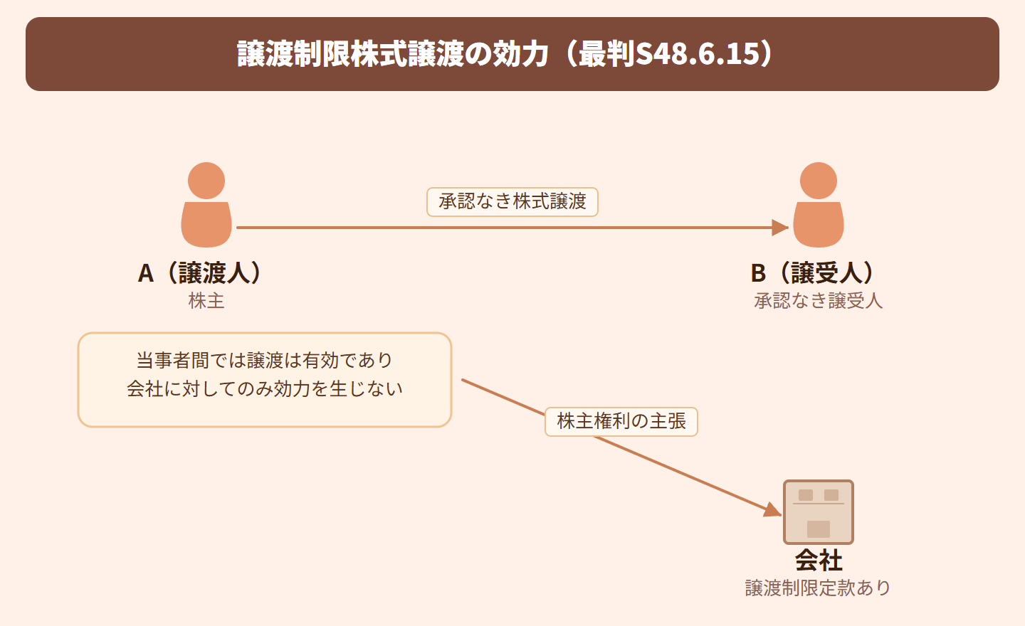 要するに、譲渡制限に違反した株式譲渡は、会社に対しては無効だけど、譲渡した当事者同士の間では有効ってこと!会社を守りつつ、当事者の取引は尊重する二段構えの判断です。